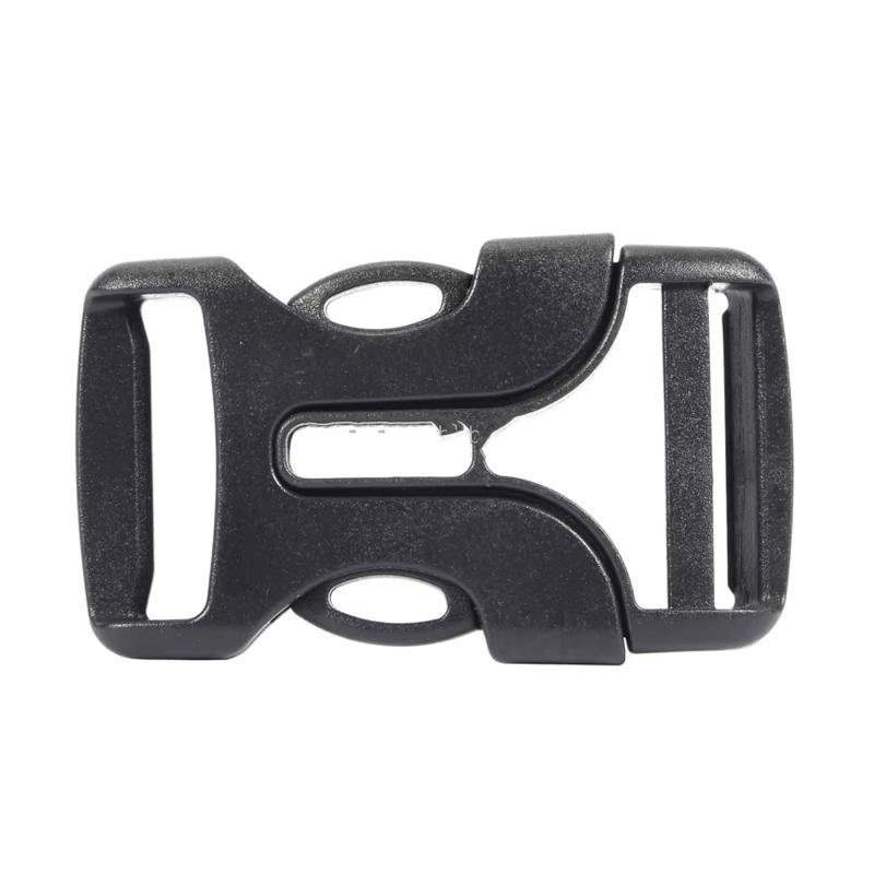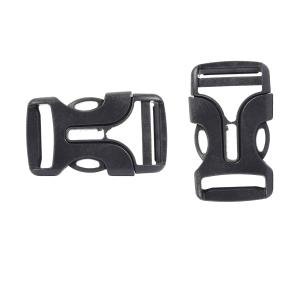 Plastic side release buckle designed with a smooth surface and durable construction for adjustable strap systems.