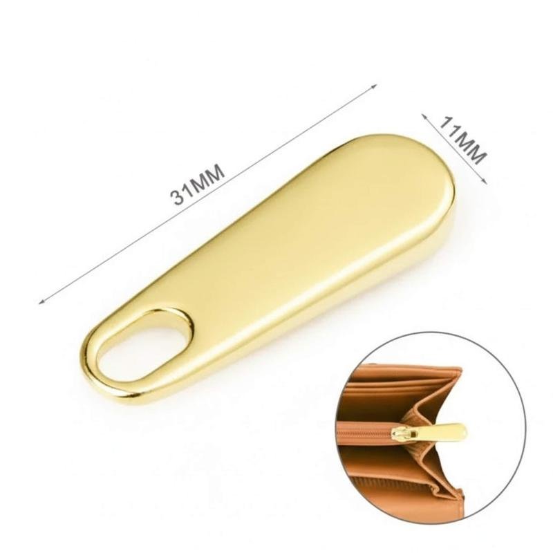 Flatstyle metal zipper puller and slider made from highquality zinc alloy with a goldplated finish, designed for durable and elegant zipper hardware.