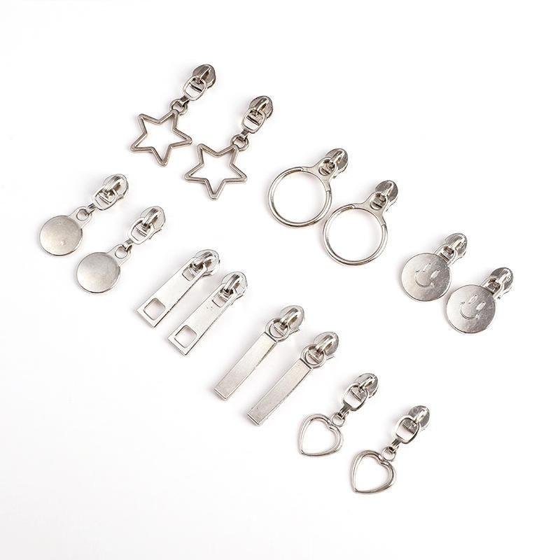 This highquality zinc alloy zipper slider is designed for garments, bags, home textiles, and shoes. Featuring a customizable logo, shape, and size, it offers flexibility for branding and design requirements. With a nonlock design and oneway auto lock slider, it ensures smooth and secure fastening. Available in multiple finishes including nickel, antibrass, brass, black nickel, and painted options, this commercialstyle zipper puller combines durability, versatility, and fashion appeal.