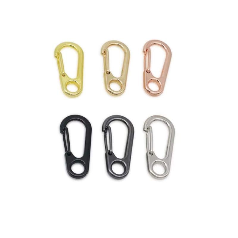 High-quality zinc alloy mini carabiner spring clip hook perfect for keychains, backpacks, and DIY crafts. Available in multiple colors including silver, gold, light gold, gunmetal, black, and rose gold. Compact, lightweight, and durable, ideal for everyday use or craft projects.