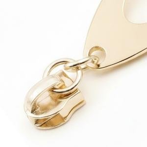 This zipper puller slider is crafted from durable zinc alloy with a golden plated finish. Featuring a non‑lock design, it ensures smooth functionality for garments and fashion accessories. Nickel‑free and washable, it combines durability with stylish appeal, making it a versatile choice for clothing applications.