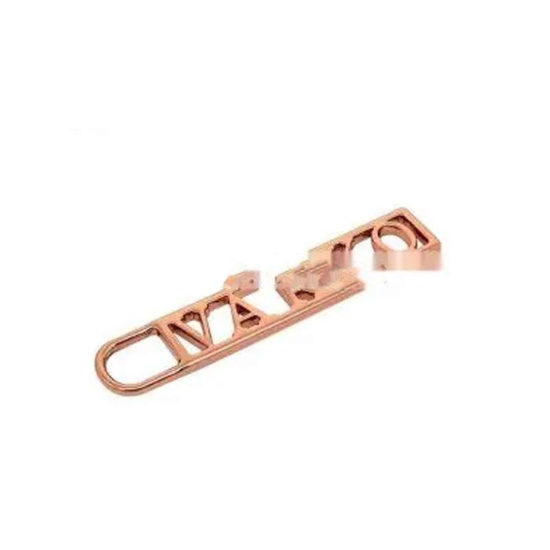 Rectangle hollow logo zipper puller made from zinc alloy with a rose gold finish, designed for decorative and durable zipper hardware.